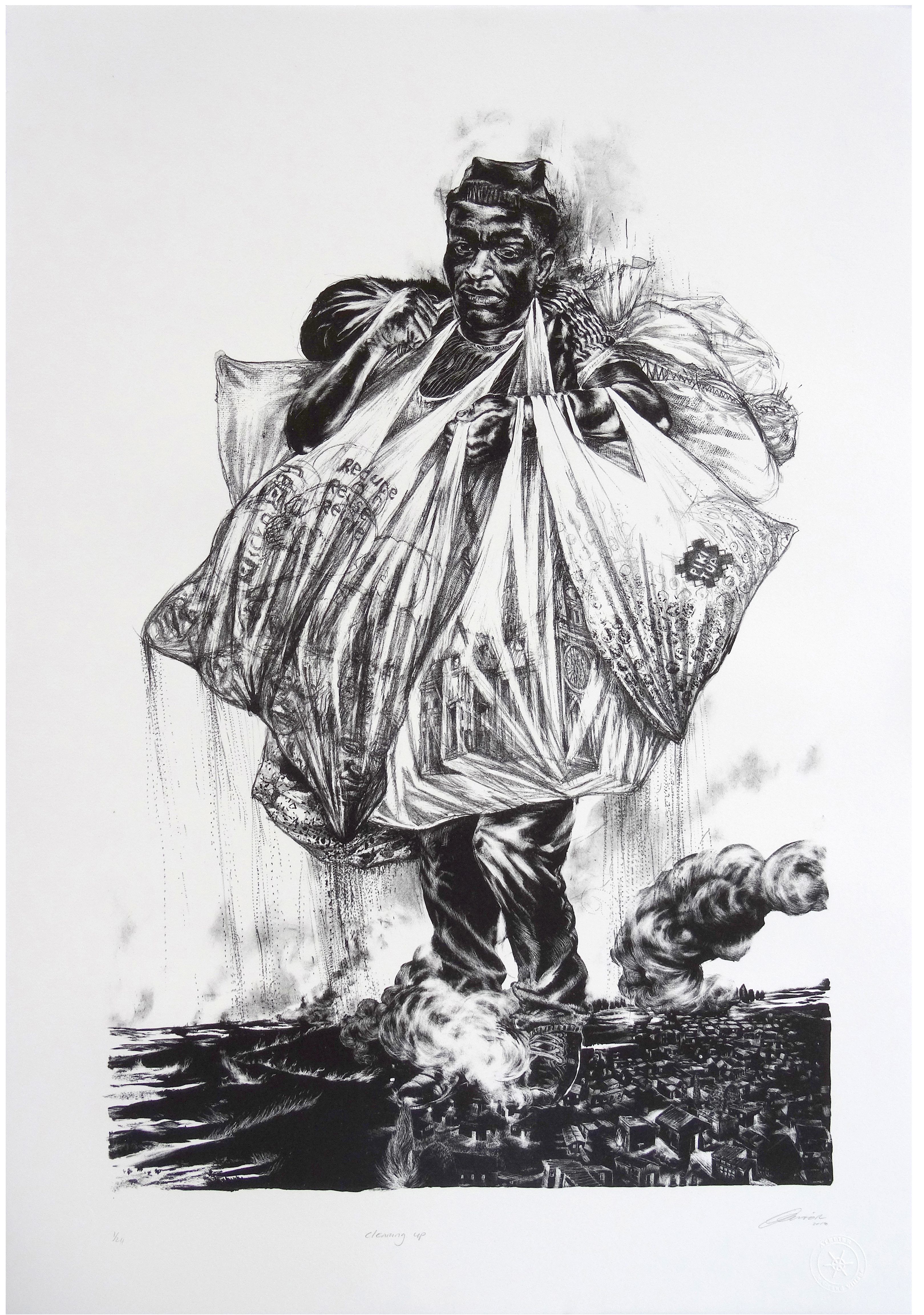 Bambo est un artiste sud-africain de Kwa Thema, à Springs près de Johannesburg. Il a fait ses études artistiques à Benoni Technical College. Il s’est ensuite formé à l’art de l’estampe à l’Artist Proof Studio de Johannesburg. Lauréat du prix Gerard Sekoto, il bénéficie d’une résidence à la Cité des Arts à Paris. Il rencontre alors Francis van der Riet et s’initie à la lithographie. Il travaille sur le thème des « Swenka ».L’origine des Swenkas remonte à la période de l’apartheid : les ouvriers qui cherchaient du travail dans les grandes villes voulaient en rentrant chez eux impressionner leur famille et leurs voisins en s’habillant avec de beaux costumes et en se comportant avec de belles manières. Ils se rencontraient pour organiser des concours de style. Les Swenkas suivent des règles comme la propreté, la sobriété et surtout le respect de soi.